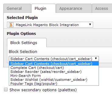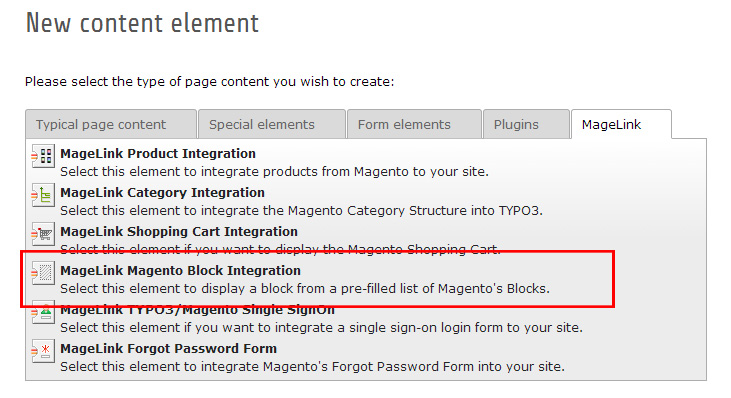 By clicking the add content button to your site, you are now able to choose “MageLink Magento Block Integration” from the “MageLink”-Tab.