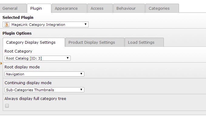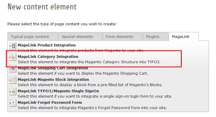By clicking the add content button to your site, you are now able to choose “MageLink Category Integration” from the “MageLink”-Tab.