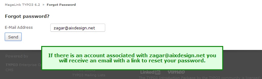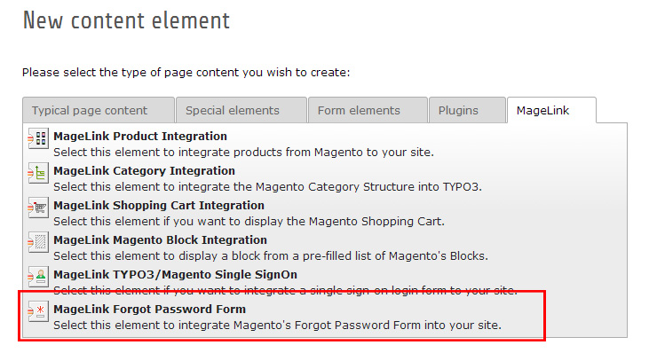 By clicking the add content button to your site, you are now able to choose “MageLink Forgot Password Form” from the “MageLink”-Tab.