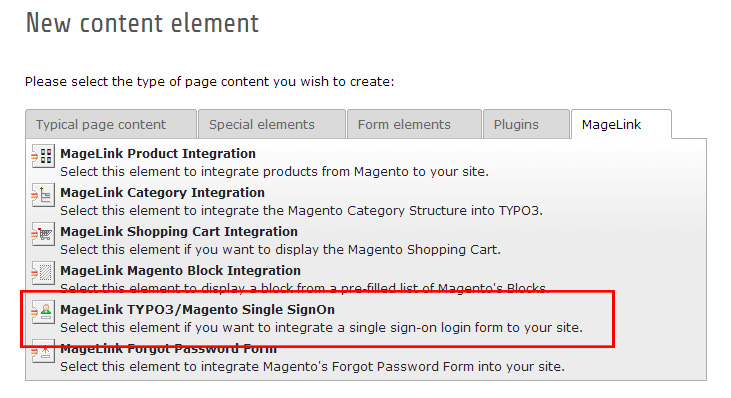 By clicking the add content button to your site, you are now able to choose “MageLink TYPO3/Magento Single SignOn” from the “MageLink”-Tab.